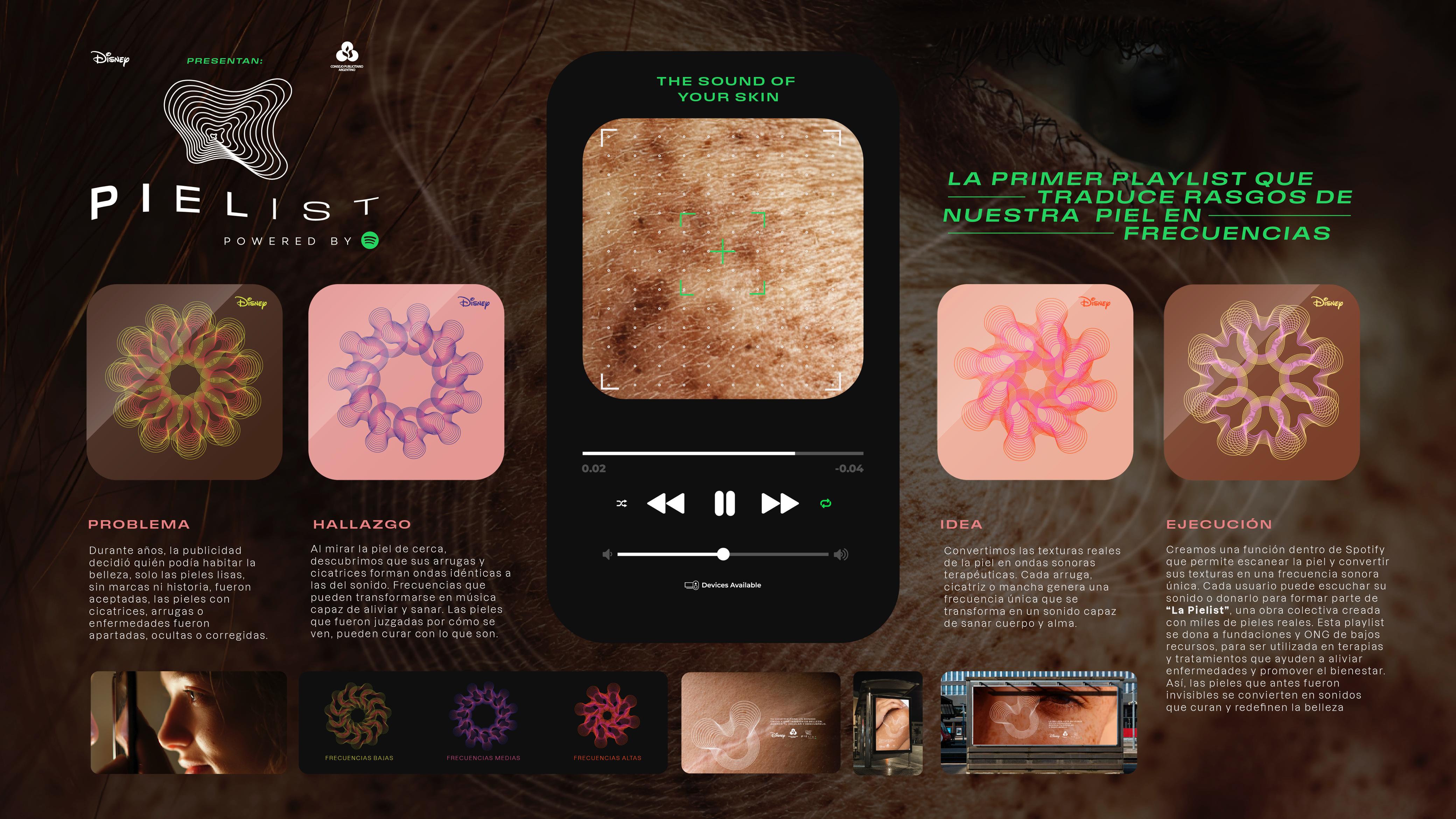 That’s how PIELIST was born. The first playlist created by Disney and the Argentine Advertising Council in partnership with Spotify, transforming real skin traits into therapeutic sound.